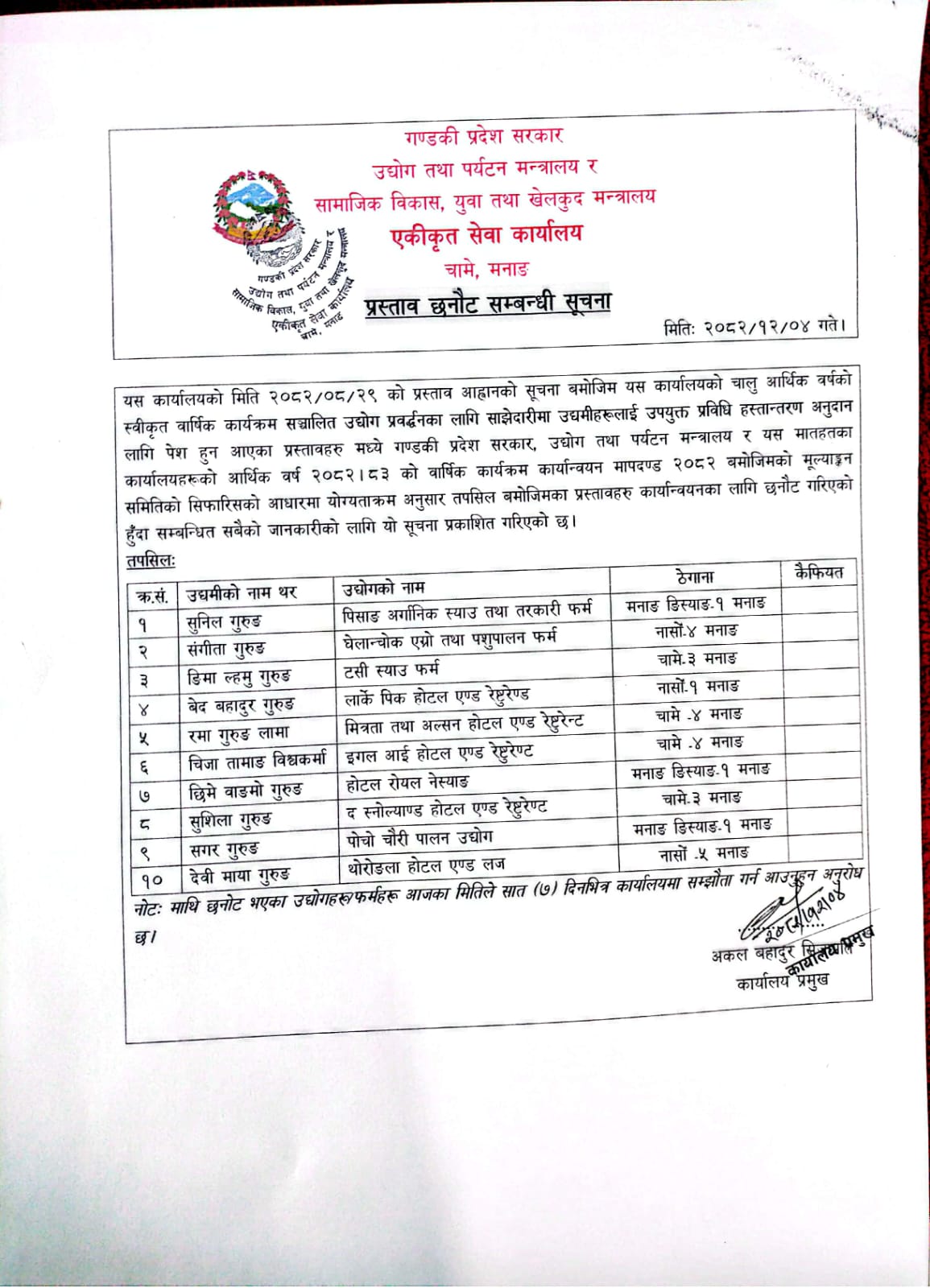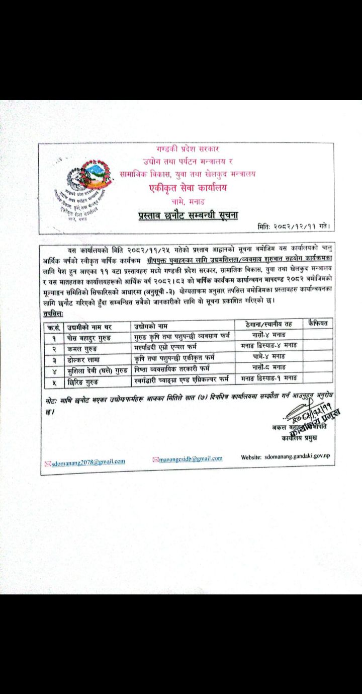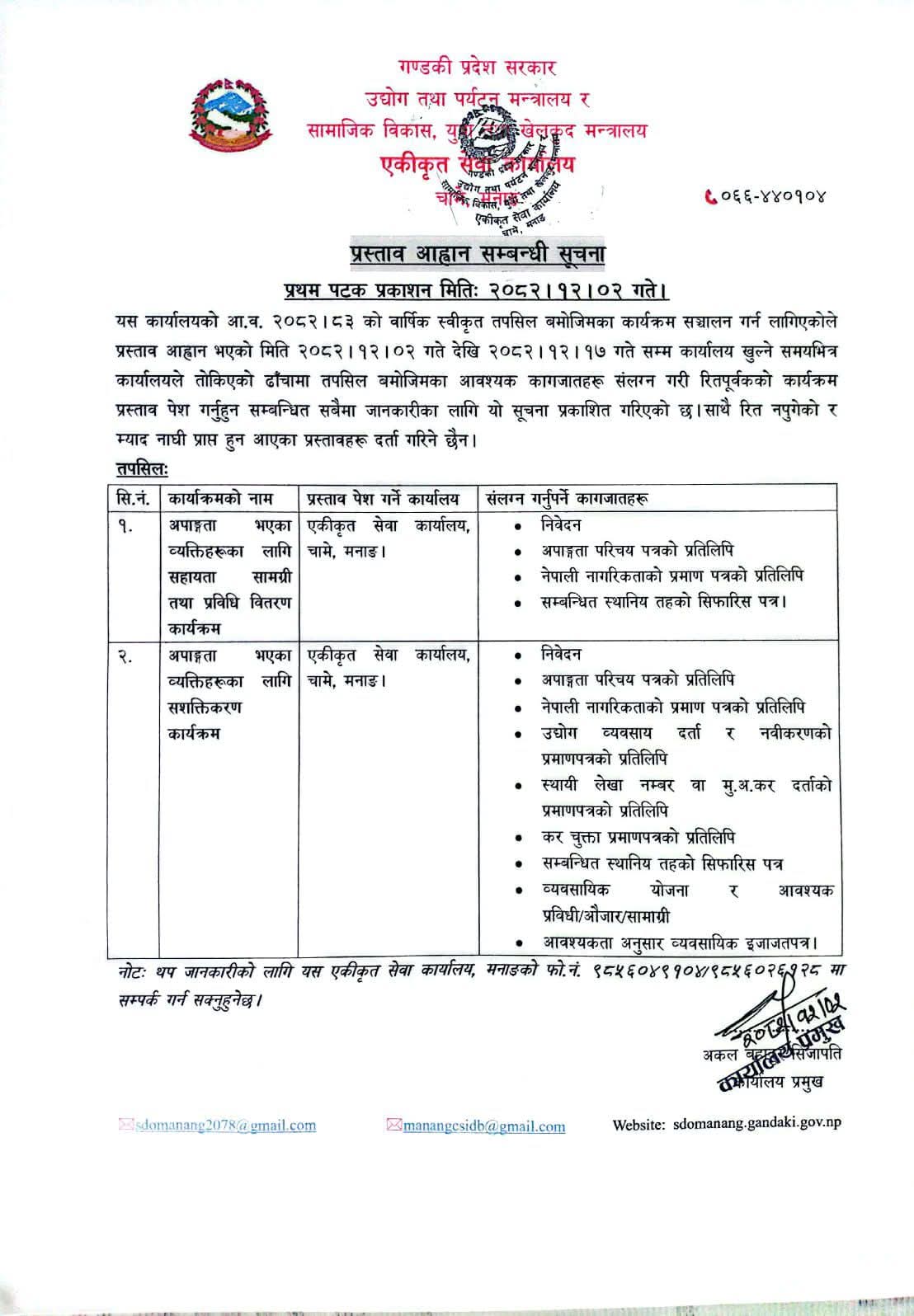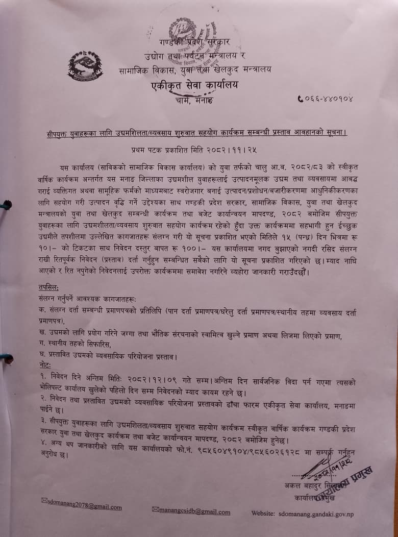 लागत साझेदारीमा कार्यक्रम तथा बजेट विनियोजन सम्बन्धी सामाजिक विकास, युवा तथा खेलकुद मन्त्रालय, गण्डीकी प्रदेश पोखराबाट जारी सूचना ।