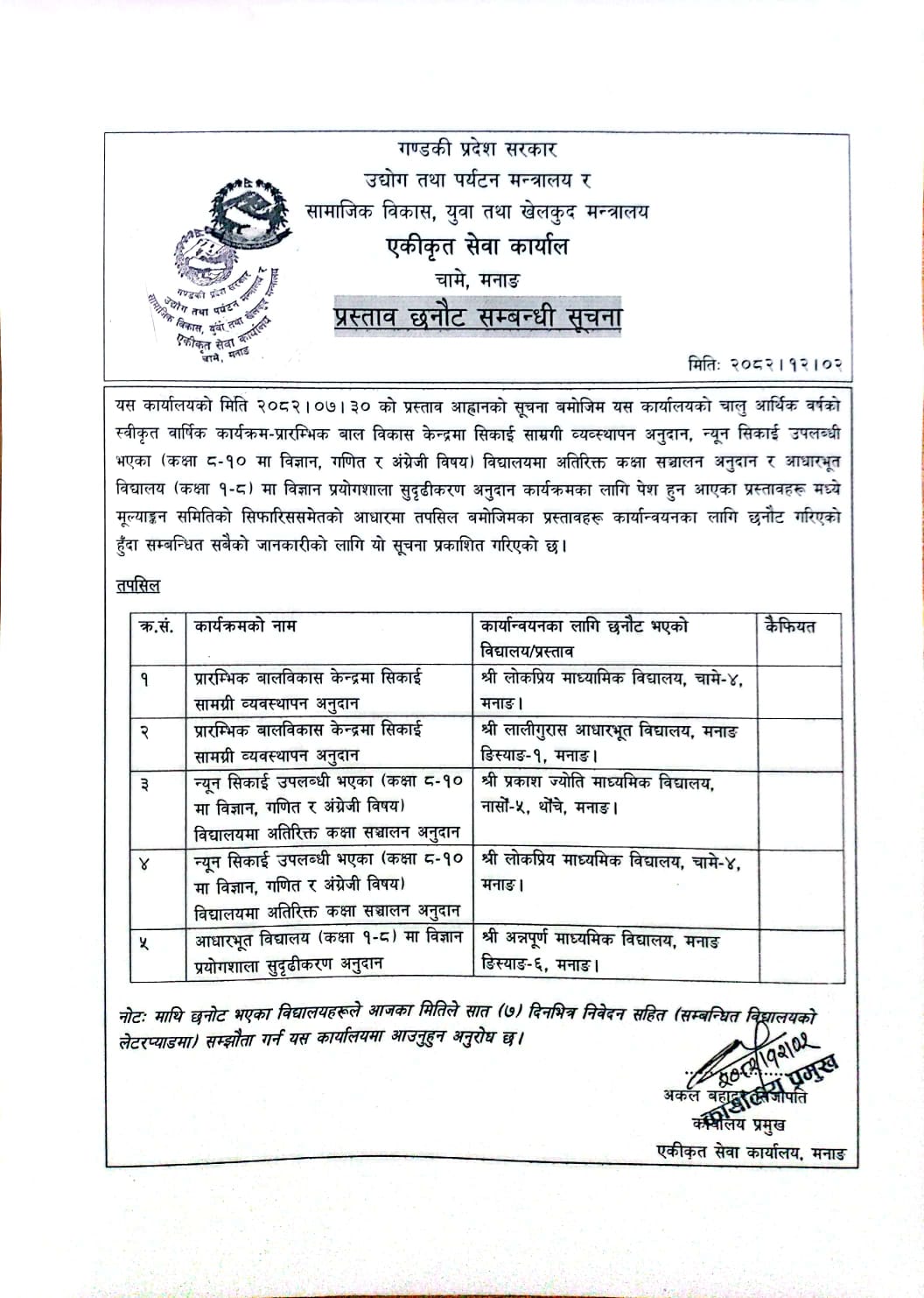 प्रारम्भिक बालविकास केन्द्रमा सिकाई सामग्री व्यवस्थापन अनुदान, न्यून सिकाई उपलब्धी भएका (कक्षा ८-१० मा विज्ञान, गणित र अंग्रेजी विषय) विद्यालयमा अतिरिक्त कक्षा सञ्चालन अनुदान र आधारभूत विद्यालय (कक्षा १-८) मा विज्ञान, प्रयोगशाला सुदृढीकरण अनुदान सम्बन्धी प्रस्ताव छनोट सम्बन्धी सूचना